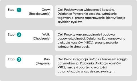 Wdrożenie FinOps przebiega zazwyczaj w trzech fazach (tzw. model Crawl, Walk, Run):