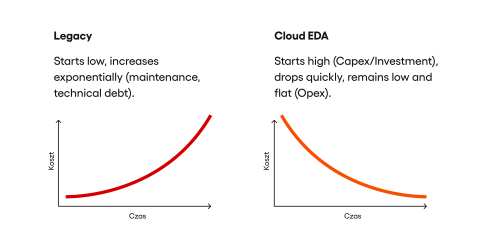 Migrating to cloud-based, event-driven architecture involves high initial capital expenditure, a significant one-off hit to financial results covering new infrastructure, licences, and the need to assemble specialist project teams. Despite the barriers to entry, long-term TCO falls thanks to two factors: auto-scalability in a pay-as-you-go model, which allows computing power to adjust dynamically to current load, and CI/CD automation of maintenance (monitoring, backups), which removes the need for manual administrator intervention. Over a five-year horizon, modern architecture generates lower operating costs.
